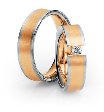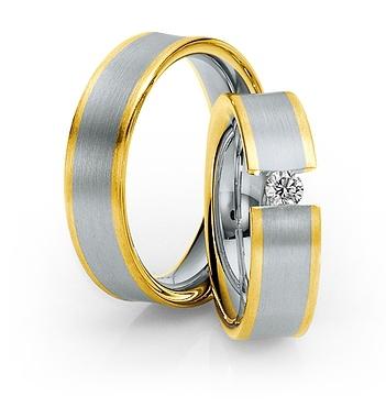 Manufaktur Saint Maurice - Deutschland . Kollektion Pas de Deux. Die Pforzheimer Manufaktur stellt nicht nur wunderschönen Schmuck sondern auch perfekt aussehende Trauringe. 585 Weißgold-Gelbgold seidenmatt. 1 Brillant 0,15 ct. W/SI. Breite 6,50 mm.