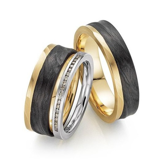 Seit der Firmengründung 1919 in Pforzheim, und das seit 4 Generationen wird das Design in Sachen Trauringe auch von der Firma „Fischer & Sohn“ mitgeprägt. Dieser Traditionelle Bestand aus Fleiss, Innovation, kompromisslose Qualitätskontrollen und das absolute Attribut: Eheringe Made in Germany. Diese Ringe sorgen für Aufsehen. Futuristische und einzigartige Ringset in 585 Apricotgold und Carbon. Dazu vollendet ein Antragsring in 2 mm Breite mit Champagner Diamanten. Carbon ist extrem leicht, so dass auch stärkere, breite Ringe ein erstaunlich niedriges Gewicht aufweisen. Das Material ist äußerst beständig gegen Chemikalien und Temperaturschwankungen und zeigt beim Tragen zudem kaum Abnutzungserscheinungen.